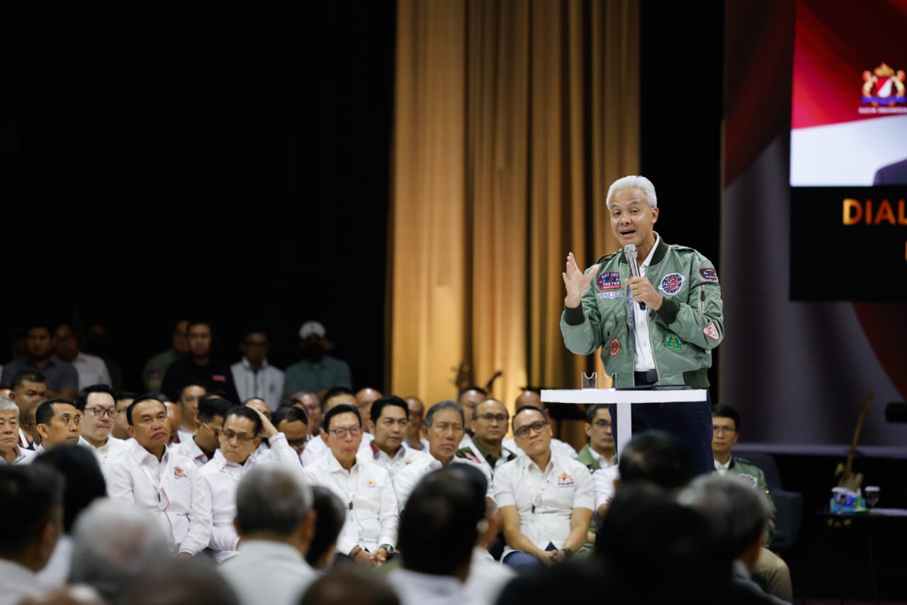 Calon presiden nomor urut 3 Ganjar Pranowo menghadiri kegiatan dialog bersama Kamar Dagang dan Industri (Kadin) Indonesia di Jakarta, Kamis (11/1/2024).