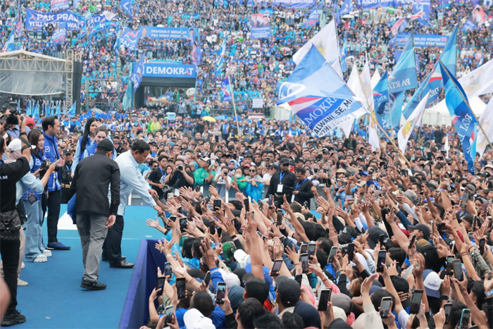 Di tengah beredarnya hoaks jatuh sakit, Capres nomor urut 2, Prabowo Subianto menyapa puluhan ribu warga Malang dalam kampanye Partai Demokrat di Stadion Gajayana, Malang, Jawa Timur, Kamis (1/2).