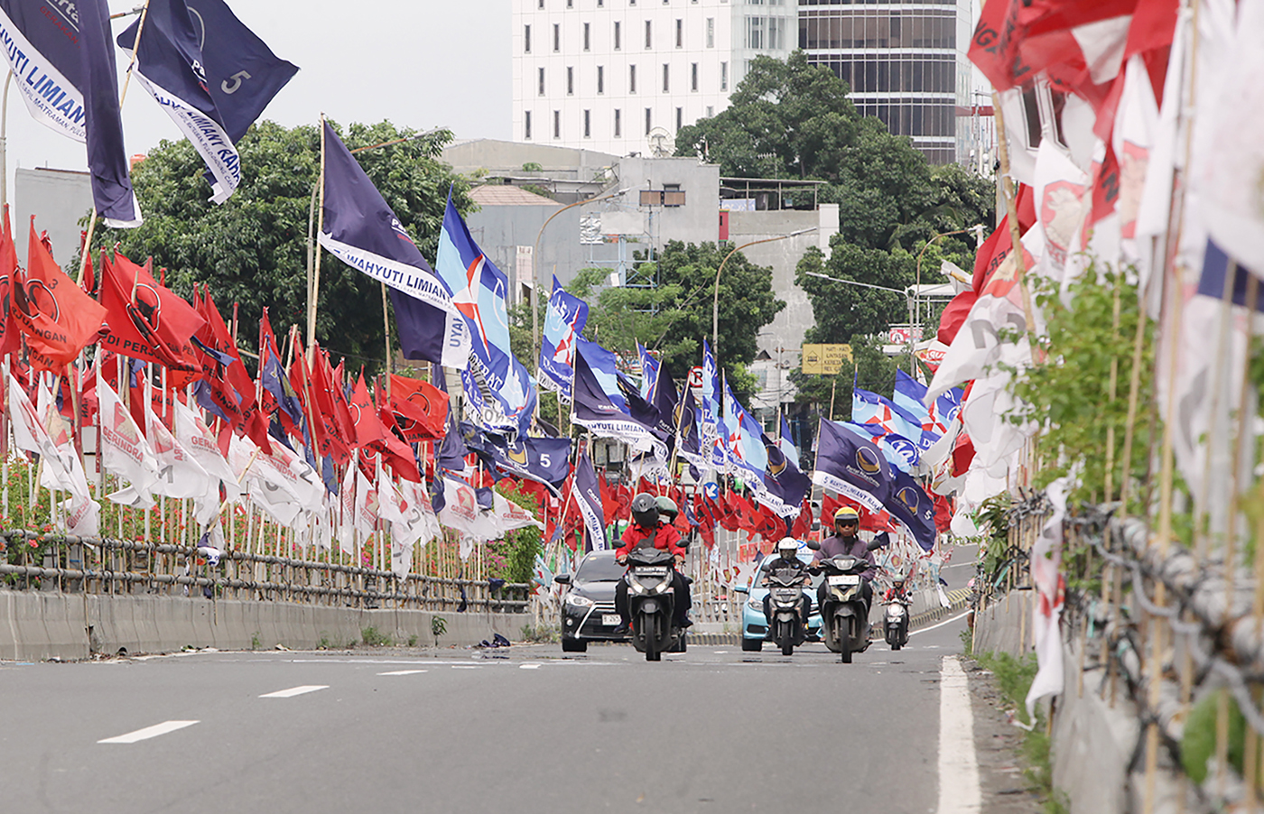 Deretan bendera partail politik membahayakan pengendara moto di fly over Matraman, Jakarta, Jumat (19/1/2024).