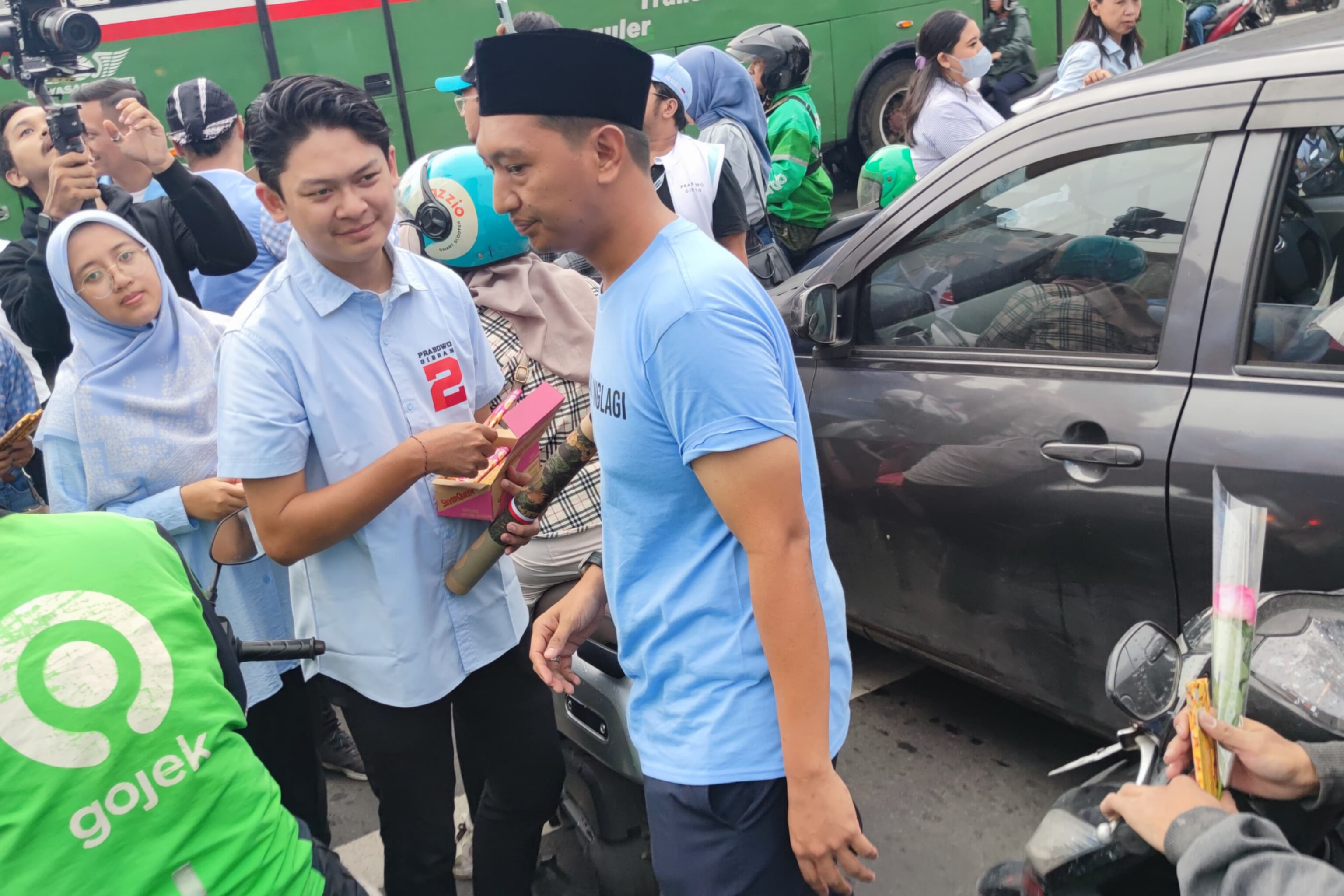 TKN Fanta Prabowo Subianto-Gibran Rakabuming Raka melakukan aksi bagi-bagi bunga dan cokelat kepada masyarakat.