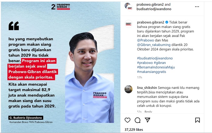 "Berdasarkan informasi yang disampaikan, klaim bahwa Program Makan Siang dan Susu Gratis akan diluncurkan pada tahun 2029 adalah tidak benar. Ini adalah salah satu program utama Prabowo-Gibran dan akan dijalankan segera setelah Pak Prabowo dan Mas Gibran dilantik sebagai presiden dan wakil presiden," ujar Budisatrio di akun Instagram @prabowo.gibran2, dikutip Sabtu (17/2).