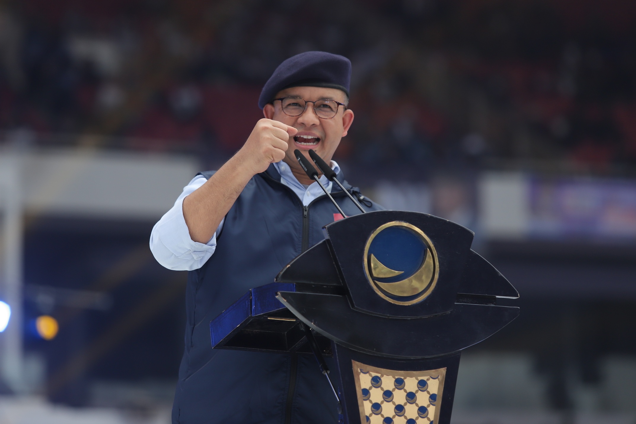 Bacapres Partai Nasdem Anies Baswedan saat berorasi politik di acara Apel Siaga Perubahan yang digelar Nasdem di Stadion GBK, Senayan, Jakarta, Minggu (16/7/2023).