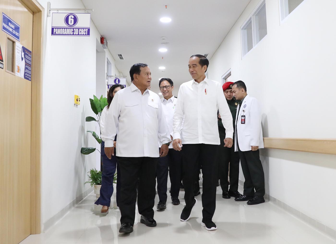 Presiden Joko Widodo didampingi Menteri Pertahanan Prabowo Subianto meninjau fasilitas rumah sakit saat peresmian Rumah Sakit Pusat Pertahanan Negara (RSPPN) Panglima Besar Soedirman di Jakarta, Senin (19/2/2024).