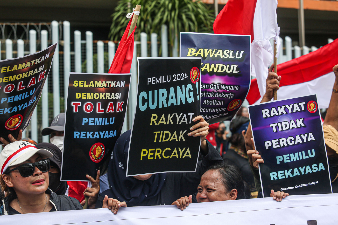 Massa yang tergabung dalam Gerakan Keadilan Rakyat melakukan aksi unjuk rasa di depan Gedung Bawaslu RI Jl MH Thamrin Jakarta, Senin (19/2/2024).