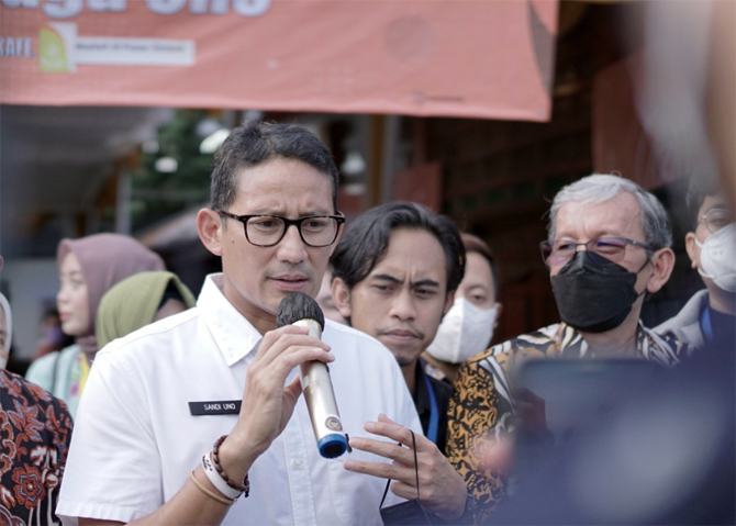 Menparekraf Sandiaga Salahuddin Uno saat bertemu dengan pelaku UMKM di Jogjakarta. Menteri Menparekraf meminta para pelaku UMKM mampu menjadi kunci kebangkitan industri kreatif dan ekonomi nasional.