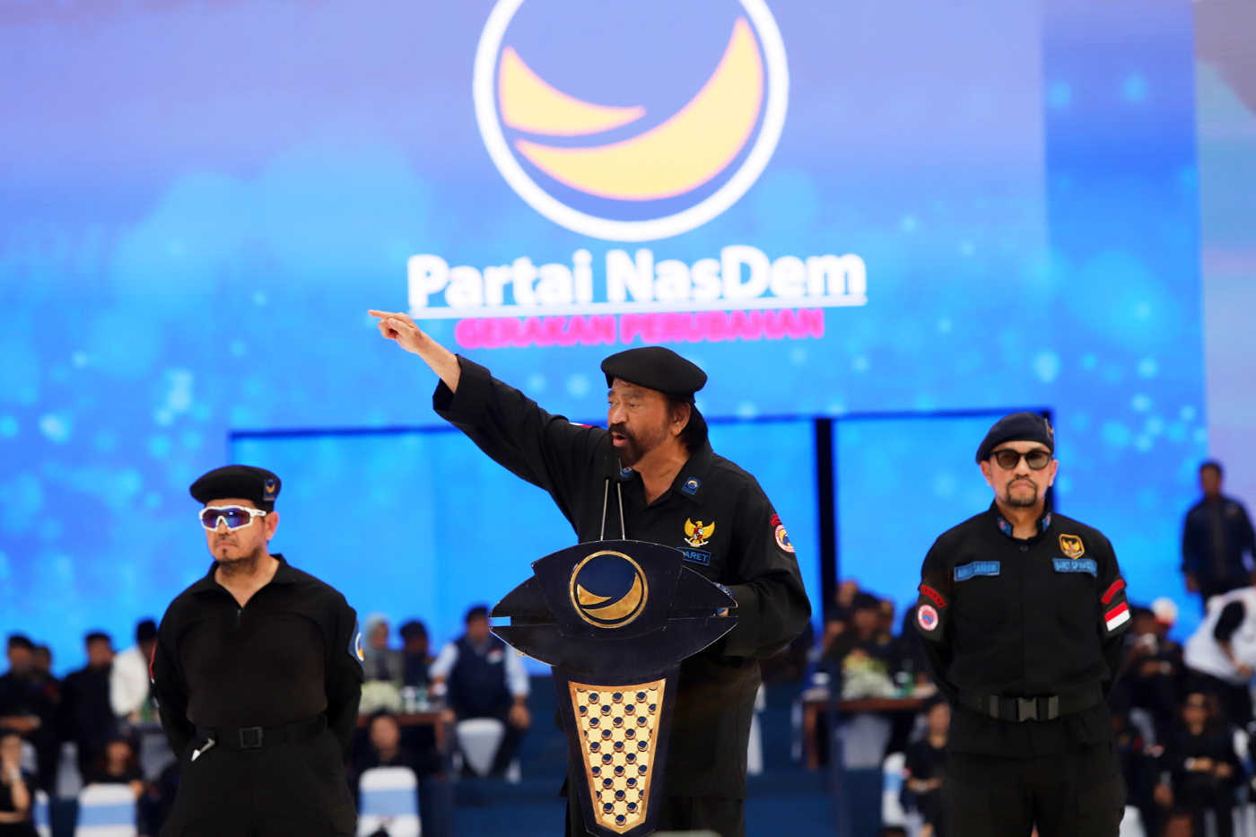 Ketua Umum Partai NasDem Surya Paloh menyampaikan pidato politik pada Apel Siaga Perubahan di Stadion Gelora Bung Karno, Jakarta, Minggu (16/7/2023). Kegiatan yang dihadiri ribuan kader dan simpatisan Partai NasDem tersebut beragendakan orasi politik dan