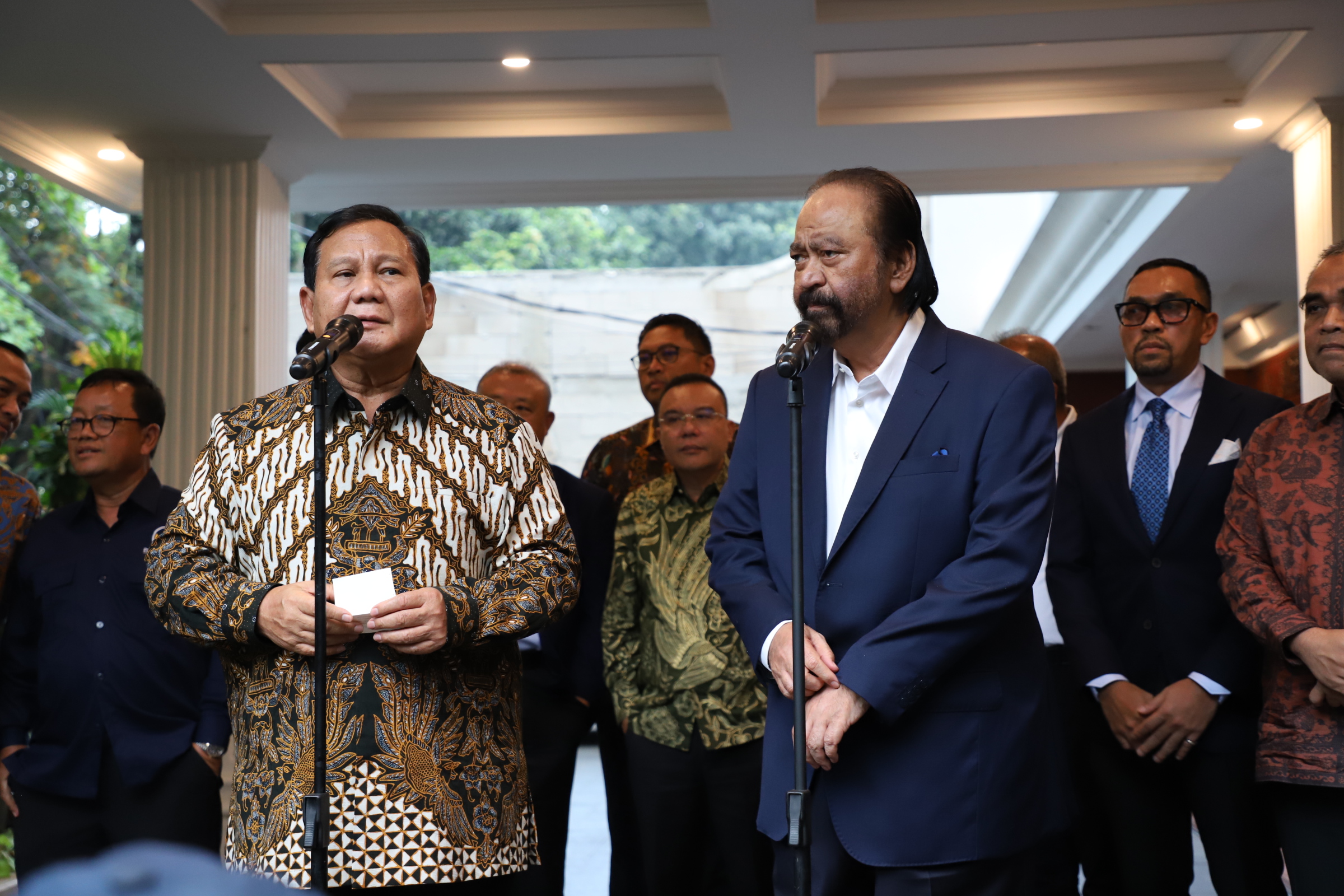 Presiden terpilih periode 2024-2029 Prabowo Subianto dab Ketua Umum Partai NasDem Surya Paloh melakukan pertemuan di Jalan Kertanegara, Jakarta, Kamis (25/4/2024).