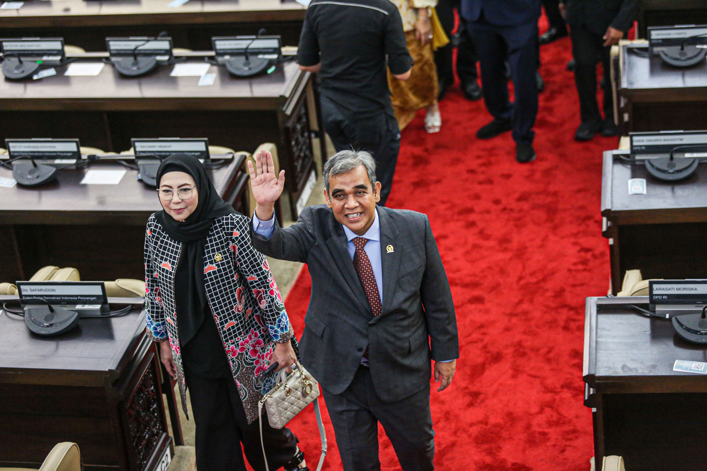Anggota MPR RI dari Fraksi Gerindra Ahmad Muzani (kanan) dan Himmatul Aliyah (kiri) berjalan meninggalkan ruangan usai mengikuti Sidang Paripurna MPR di Gedung Nusantara, Kompleks Parlemen, Senayan, Jakarta, Rabu (2/10/2024). (Miftahul Hayat/Jawa Pos