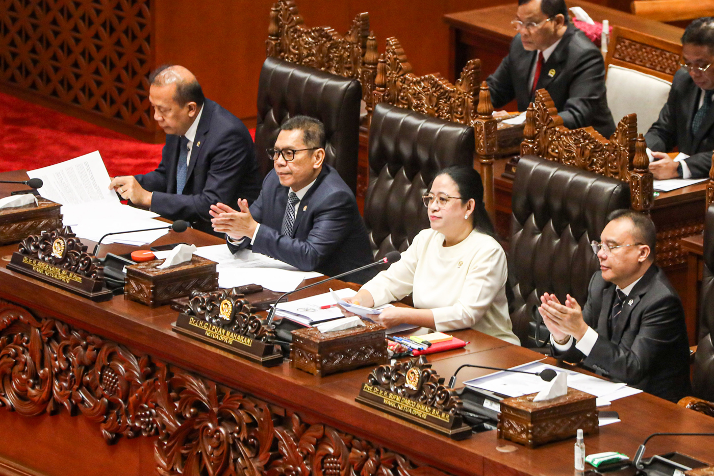 Ketua DPR Puan Maharani (kedua kanan) bersama Wakil Ketua DPR Sufmi Dasco Ahmad (kanan), Adies Kadir (kedua kiri) dan Saan Mustopa (kiri) pada Rapat Paripurna ke-15 DPR Masa Persidangan II Tahun Sidang 2024-2025 di Kompleks Parlemen, Senayan, Jakarta, Kam