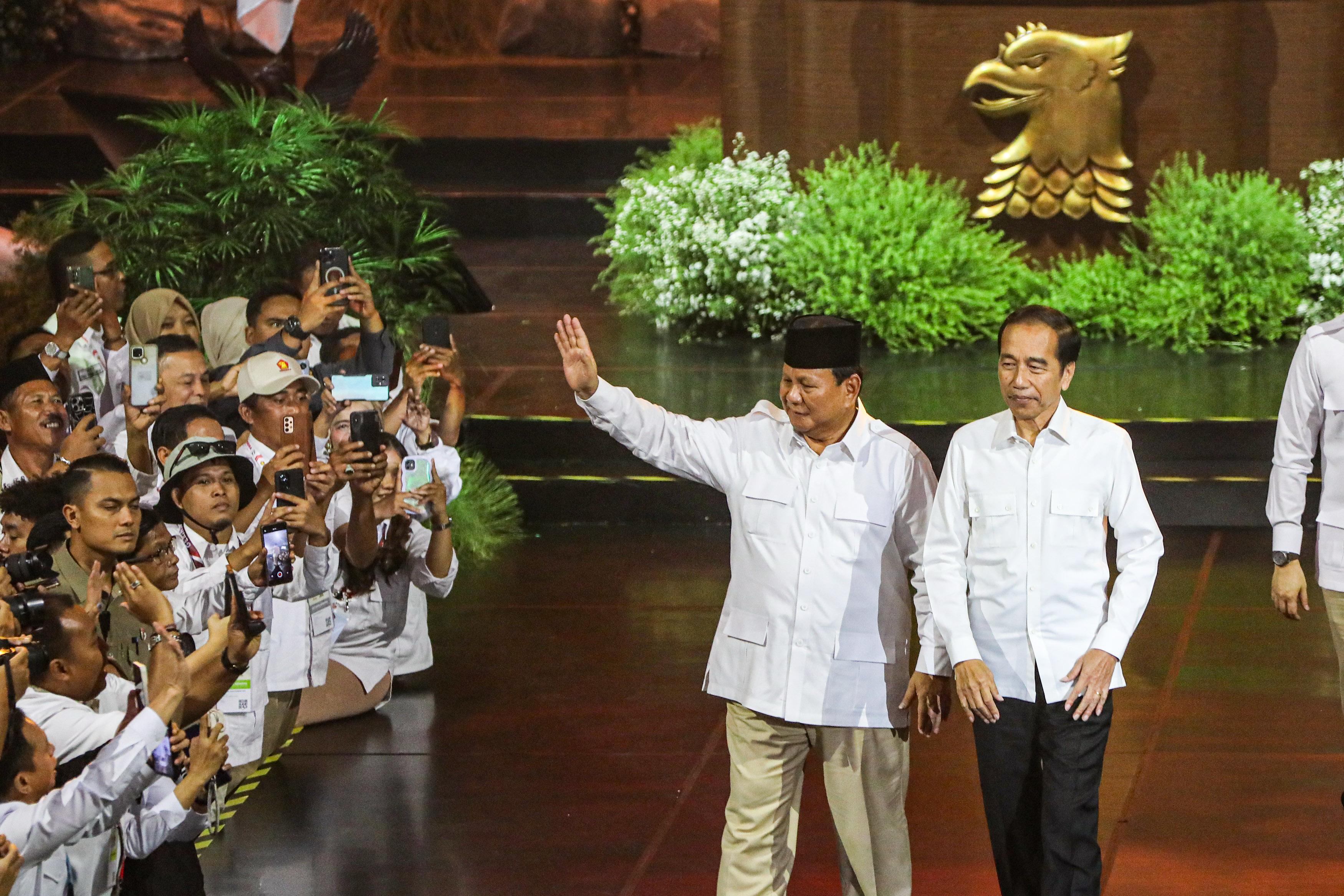 Presiden Prabowo Subianto bersama Presiden ke-7 RI Joko Widodo (Jokowi) pada HUT ke-17 Partai Gerindra di SICC, Bogor, Jabar. (Salman Toyibi/JawaPos).
