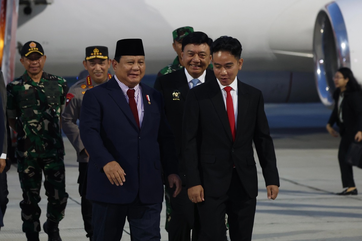 Presiden Prabowo Subianto disambut Wakil Presiden Gibran Rakabuming Raka saat tiba di Bandara Halim Perdana Kusuma, Jakarta, pada Minggu (24/11). (istimewa)