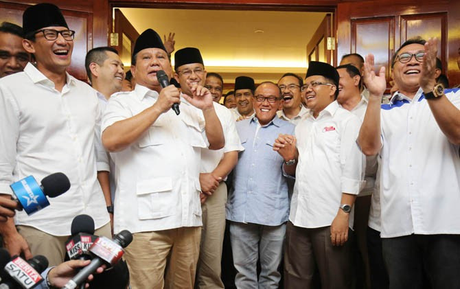Ketua Umum Partai Gerindra Prabowo Subianto bersama Gubernur DKI Jakarta Anies Baswedan dan Wakilnya Sandiaga Salahudin Uno