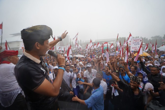 Usai berorasi, Sandiaga kembali menerima sumbangan uang dari pendukungnya saat orasi kampanye di Jalan Lingkar Selatan, Cibereum, Kota Sukabumi. Di atas panggung, Sandi banyak diberikan pecahan uang yang beragam oleh pendukungnya.