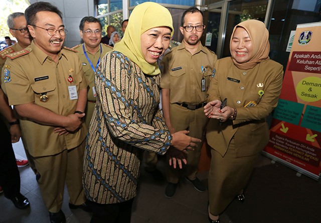 Gubernur Jatim Khofifah Indar Parawansa saat memasuki Graha Amerta RSUD dr Soetomo.