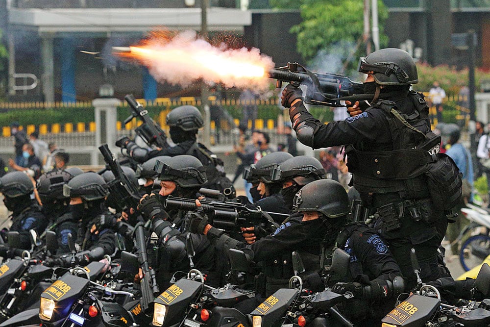 HALAU PENDEMO: Polisi menembakkan gas air mata untuk membubarkan demonstran. (MIFTAHULHAYAT/JAWA POS)