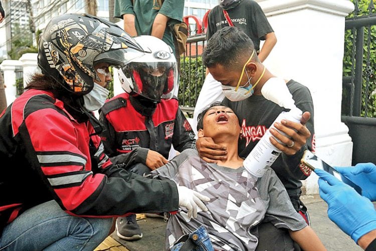 BUTUH PERTOLONGAN: Seorang demonstran terkena tembakan gas air mata saat unjuk rasa menolak UU Cipta Kerja di kawasan Monas, Jakarta Selasa (13/10). (SALMAN TOYIBI/JAWA POS)
