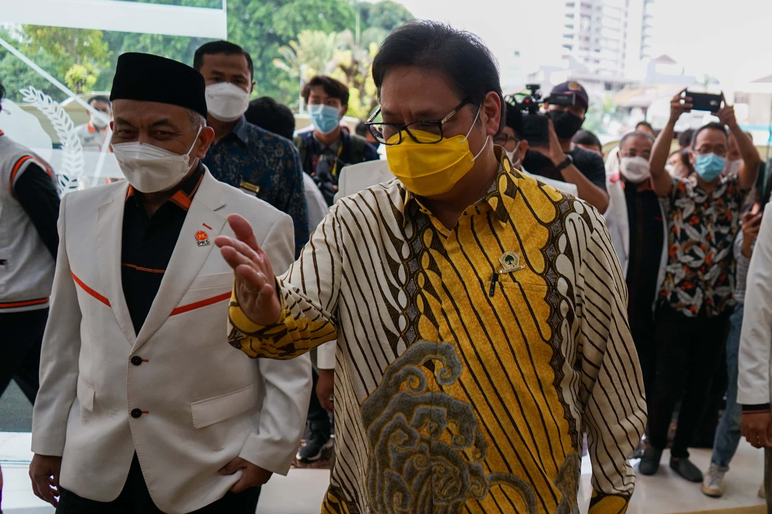 Ketua Umum Partai Golongan Karya (Golkar) Airlangga Hartanto (kanan) menyambut kedatangan Presiden Partai Keadilan Sosial (PKS) Ahmad Syaikhu (kiri) Saat tiba di kantor DPP Partai Golkar, Jakarta, Kamis (29/04). Silahturahmi kebangsaan ini turut membahas