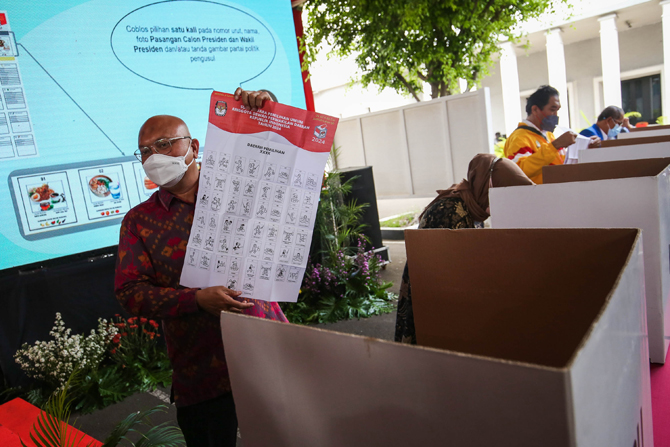 Ketua Komisi Pemilihan Umum (KPU) Ilham Saputra mengikuti simulasi pemungutan dan penghitungan suara dengan desain surat suara dan formulir yang disederhanakan untuk pemilu tahun 2024 di Halaman Kantor KPU, Jakarta, Selasa (22/3/2022). Penyelenggaraan sim