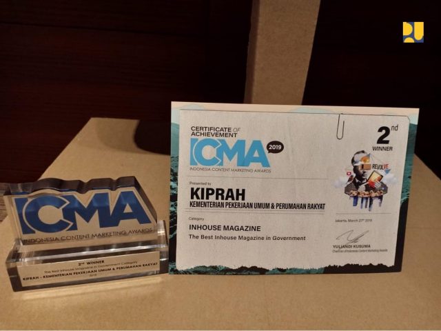 Pada ajang penghargaan lainnya yakni Indonesia Content Marketing Awards (ICMA) 2019, Kementerian PUPR meraih juara kedua The Best Inhouse Magazine in Government Category untuk Majalah KIPRAH yang diterbitkan Biro Komunikasi Publik Kementerian PUPR dengan tema utama ‘Menata Hunian Menuju Kota Tangguh’.