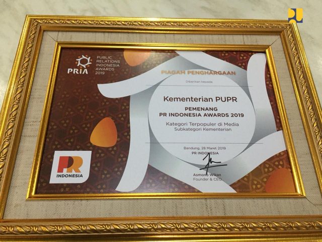 JawaPos.com – Kementerian Pekerjaan Umum dan Perumahan Rakyat (PUPR) menerima penghargaan Public Relations Indonesia Awards (PRIA) 2019 kategori Terpopuler di Media Subkategori Kementerian yang diselenggarakan oleh PR Indonesia di Bandung, Kamis (28/3). Penghargaan tersebut diberikan oleh CEO PR Indonesia Asmono Wikan dan terima oleh Staf Ahli Menteri PUPR Bidang Sosial Budaya dan Peran Masyarakat Sudirman mewakili Menteri PUPR Basuki Hadimuljono.