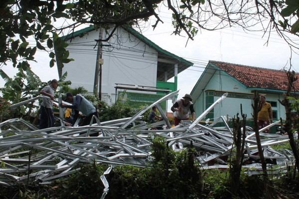 Atap baja ringan SMK PUI Haurgeulis terbang diterjang puting beliung, Senin (2/1). Kholil Ibrohim/Radar Indramayu