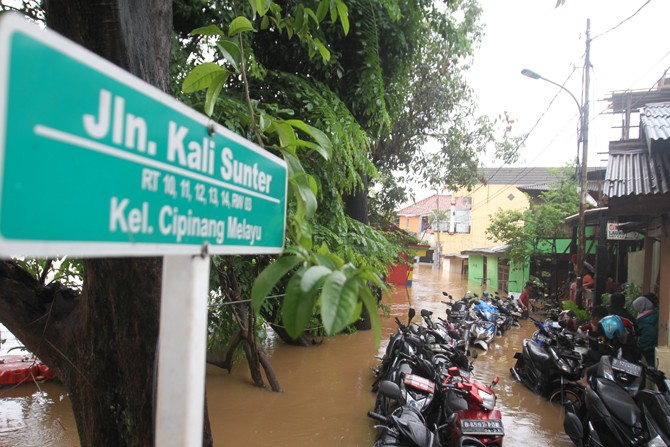 Warga beraktivitas ketika banjir di kawasan Cipinang Melayu, Jakarta, Rabu (1/1/2020). Banjir yang terjadi di kawasan tersebut akibat luapan air dari Kali Sunter. Foto: Dery Ridwansah/ JawaPos.com