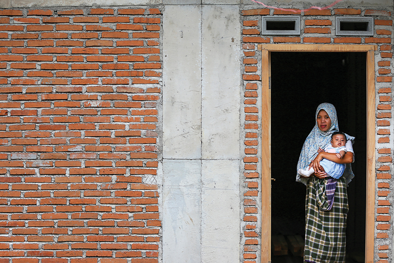 TERBUKA: Penghuni rumah instan sederhana sehat (risha) menggendong bayinya di depan pintu yang b aru terpasang kusen saja di Desa Wadon. (LOMBOK POST)