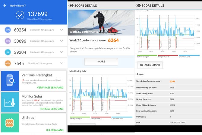 Untuk hasil simulasi menggunakan aplikasi populer AnTuTu Benchmark dan AnTuTu 3D Bench, Redm Note 7 mampu menghasilkan perolehan skor keseluruhan dengan angka 137699. Sementara untuk hasil pengujian menggunakan PC Mark (Work 2.0 Performance), Redmi Note 7 berhasil membukukan skor 6264.