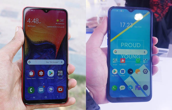 Smartphone Samsung Galaxy A10 (kiri) dan Realme C2. (PhoneYear dan Rian Alfianto/JawaPos.com)