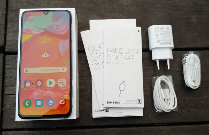 Seperti sudah disinggung di atas, ini adalah perangkat Samsung. Jangan tanya soal kelengkapan paket penjualannya. Jika dibandingkan dengan merek kompetitor Tiongkok yang sering kali terkesan abai terhadap aspek kelengkapan pembelian di dalam boks-nya, lain lagi dengan Samsung. Kitab-kitab pendukung beserta kartu garansi, kabel konektor daya dan transfer data Type-C, kepala charger, earphone, serta SIM Ejector hadir menemani penjualan Samsung Galaxy A70. Pada perangkat Galaxy A70 ada yang unik. Kabelnya yang berfungsi sebagai transfer data dan daya melenggang dengan kepala Type-C juga. Jadi kabelnya adalah kabel C to C. Artinya, pada perangkat kepala charger-nya juga tertanam slot USB Type-C.