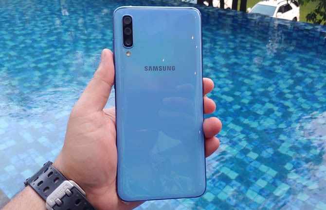 Beralih ke bagian belakang, ada tiga buah kamera utama disusun secara vertikal. Lagi-lagi konsep tersebut mengingatkan kami pada desain Galaxy A50. Di bawah kamera ada LED Flash untuk beberapa kebutuhan foto dan video tambahan. Seperti sudah dijelaskan di atas, bagian belakangnya mengkilap. Selain kamera dan LED Flash, bagian belakang terkesan polos. Hanya terdapat logo Samsung di bagian tengah dengan kesan mengkilap yang memantulkan warna pelangi jika dilihat dari sudut tertentu kala tersorot cahaya.