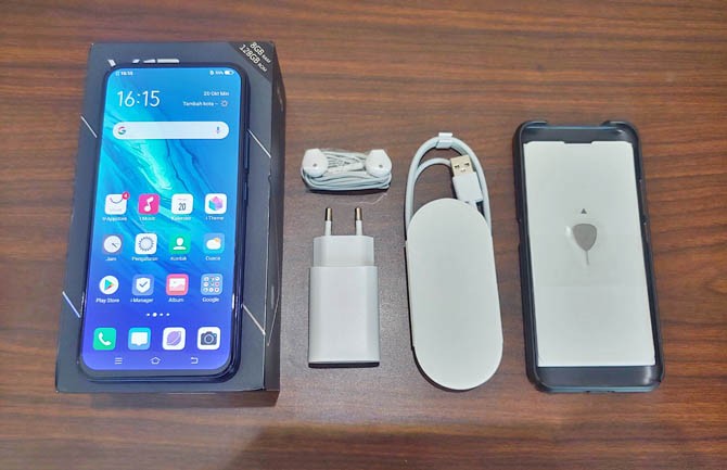 Beralih ke bagian dalam. Di dalam kemasan terdapat satu buah charger dengan output 5V 2A belum pengisian cepat seperti saudaranya, Realme 5 Pro ataupun Oppo yang sudah menggunakan VOOC Flash Charge 3.0. Keperluan lain penunjang perangkat di dalam paket penjualan ada USB cable Type-C, kitab-kitab panduan termasuk kartu garansi, SIM card tool ejector, screen protect film depan dan belakang (langsung terpasang di perangkat), sebuah hard case untuk melindungi casing belakangnya, juga tak lupa ada earphone.