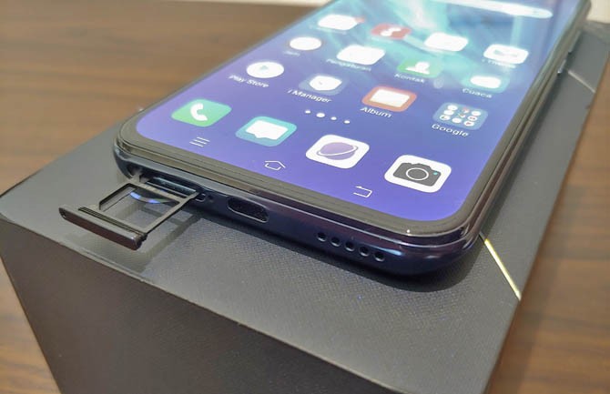 Sampai kepada bagian depan, yakni layarnya. Vivo V17 Pro hadir dengan bezel yang cukup tipis, baik di kiri-kanan maupun atas-bawah. Karena mengusung modul pop-up, handset ini di area layar tidak membawa takik atau notch. Layarnya full.