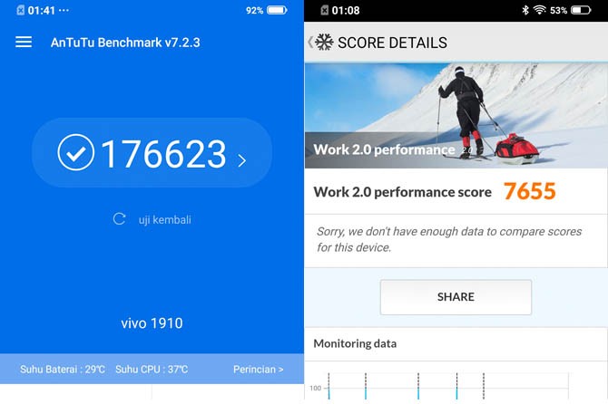Untuk hasil simulasi menggunakan aplikasi populer AnTuTu Benchmark dan AnTuTu 3D Bench, Vivo V17 Pro mampu menghasilkan perolehan skor keseluruhan dengan angka 179134. Skor AnTuTu-nya kalah jika dibandingkan dengan Realme 5 Pro di segmen Rp 3 jutaan dengan Snapdragon 712 AIE yang mampu membukukan skor 181166.