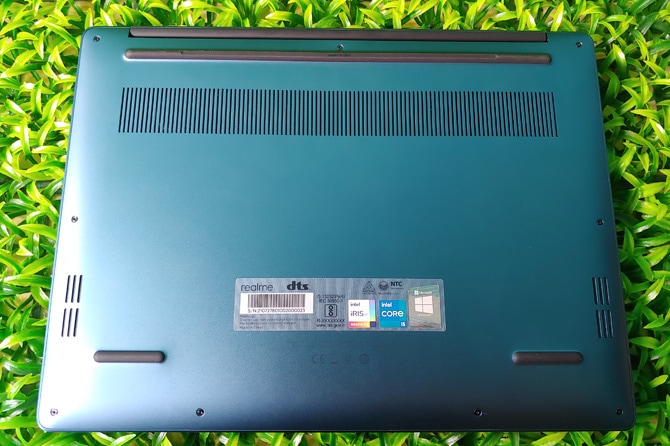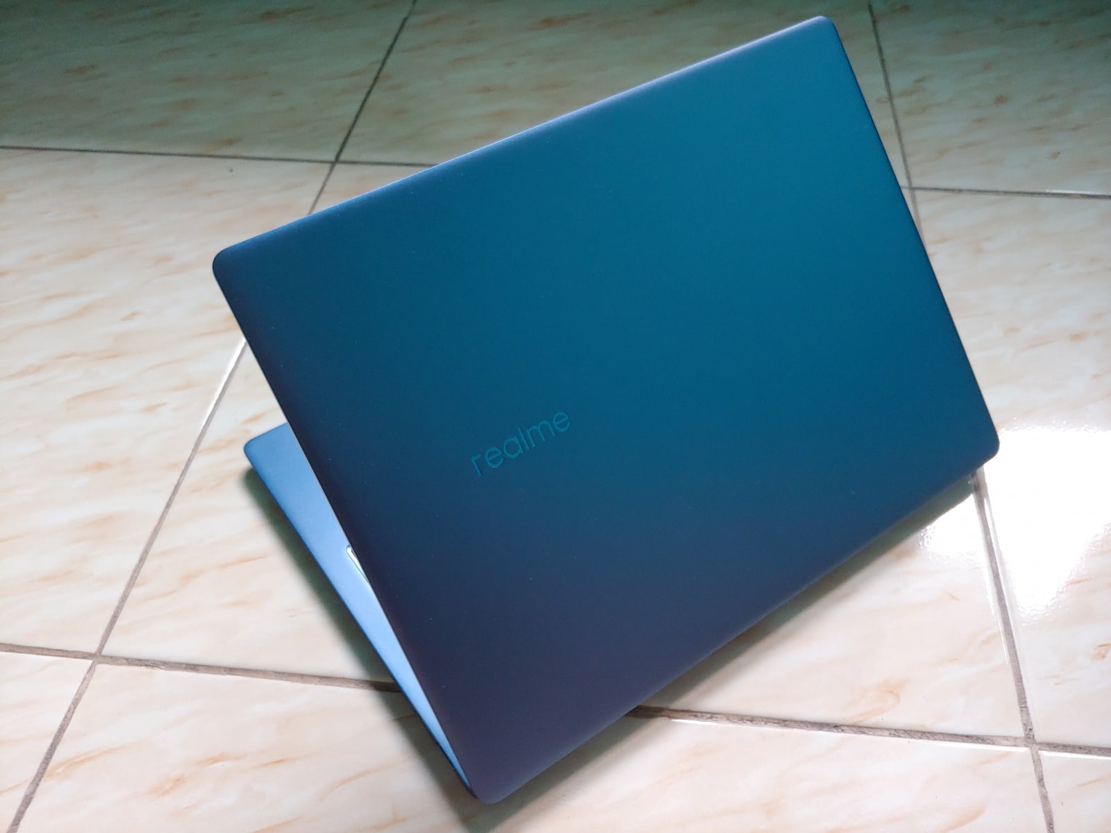 Di bagian depan perangkat hanya ada tulisan “Realme” sebagai identitas. Tulisan yang sama ada pada area hinge atau mekanisme antara lipatan layar dan keyboard. Cukup itu saja, tak ada identitas berlebihan tampak pada laptop ini.
