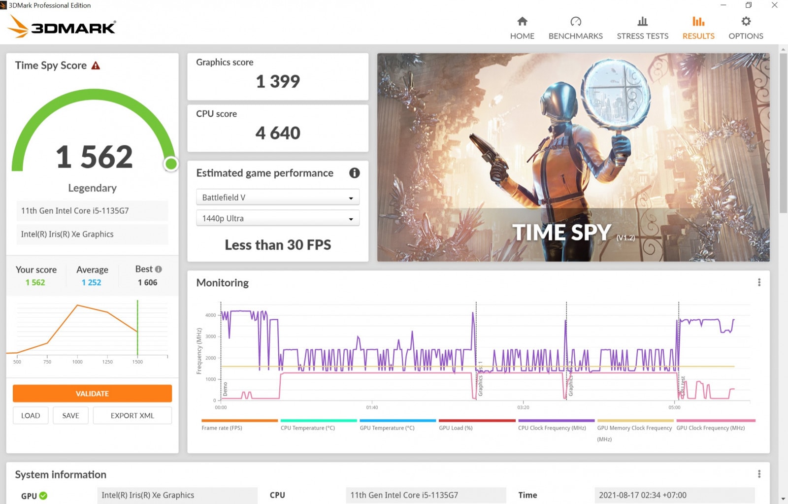 Dimulai dari hasil benchmark menggunakan 3D Mark Time Spy, Realme Book berhasil membukukan skor sebesar 1562. Skor CPU diperoleh di angka 4640 sementara skor grafis di angka 1399.