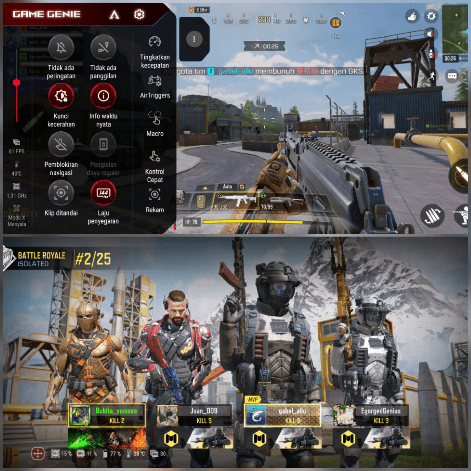 Ketika memainkan tiga game battle royale tadi, kami turut memanfaatkan fitur tombol virtual yang menyerupai L1 dan R1 di controller PlayStation, yaitu Air Trigger. Tombol ini terletak di bagian bingkai ujung atas dan bawah kanan ponsel ketika ponsel dalam posisi portrait.