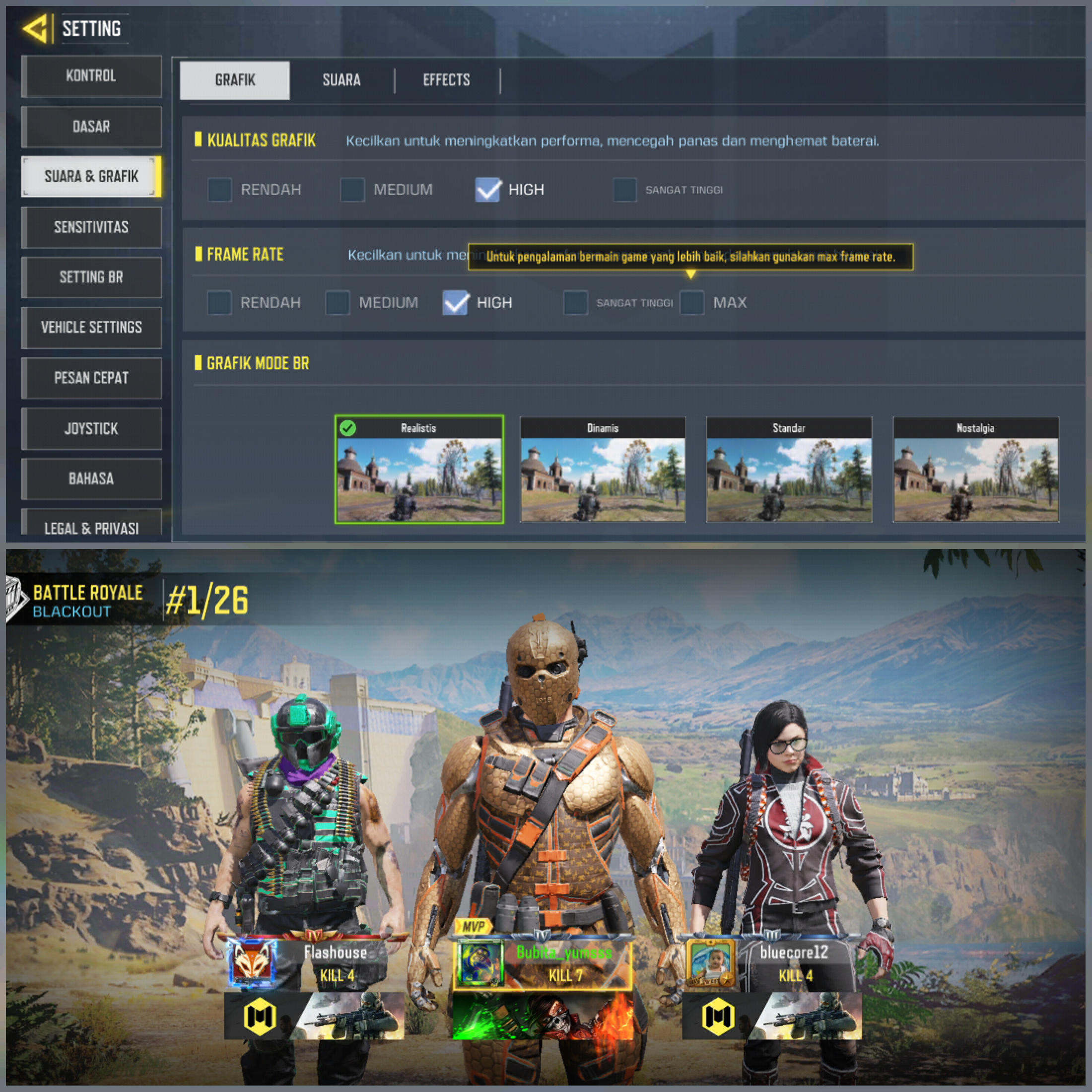 Ingat, itu pengaturan default yang dipilih oleh sistem secara otomatis dan masih bisa ditingkatkan. Artinya secara teknis, sistem membaca perangkat ini memang bisa menjalankan pengaturan demikian. Pun demikian saat dijajal ke game Mobile Legends: Bang Bang, grafik dan frame rate sanggup dibuat rata kanan dan membuat pengalaman bermain game terasa halus tanpa lag.
