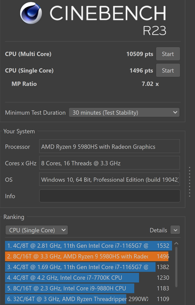 Saat menjalankan Cinebench R23, kemampuan AMD Ryzen 9 5980HS makin terlihat. Untuk skor single core, nilainya 1.496 pts, dan skor multicore yang tembus 10.509 pts. Tingginya skor menunjukkan AMD Ryzen 9 5980HS pada ASUS ROG Flow X13 siap untuk mengerjakan tugas yang berat.