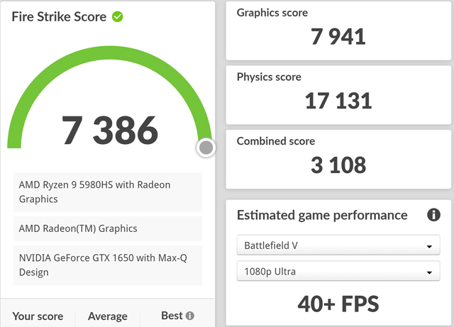 Saat menjalankan Fire Strike skor yang didapat adalah 7.386 dengan nilai Physics Score yang sangat tinggi yakni 17.131. Sedangkan Graphics Score 7.941 dan Combined Score 3.108. Versi Fire Strike, menjalankan GTA V di resolusi 1920x1080 akan mendapatkan lebih dari 35 FPS.