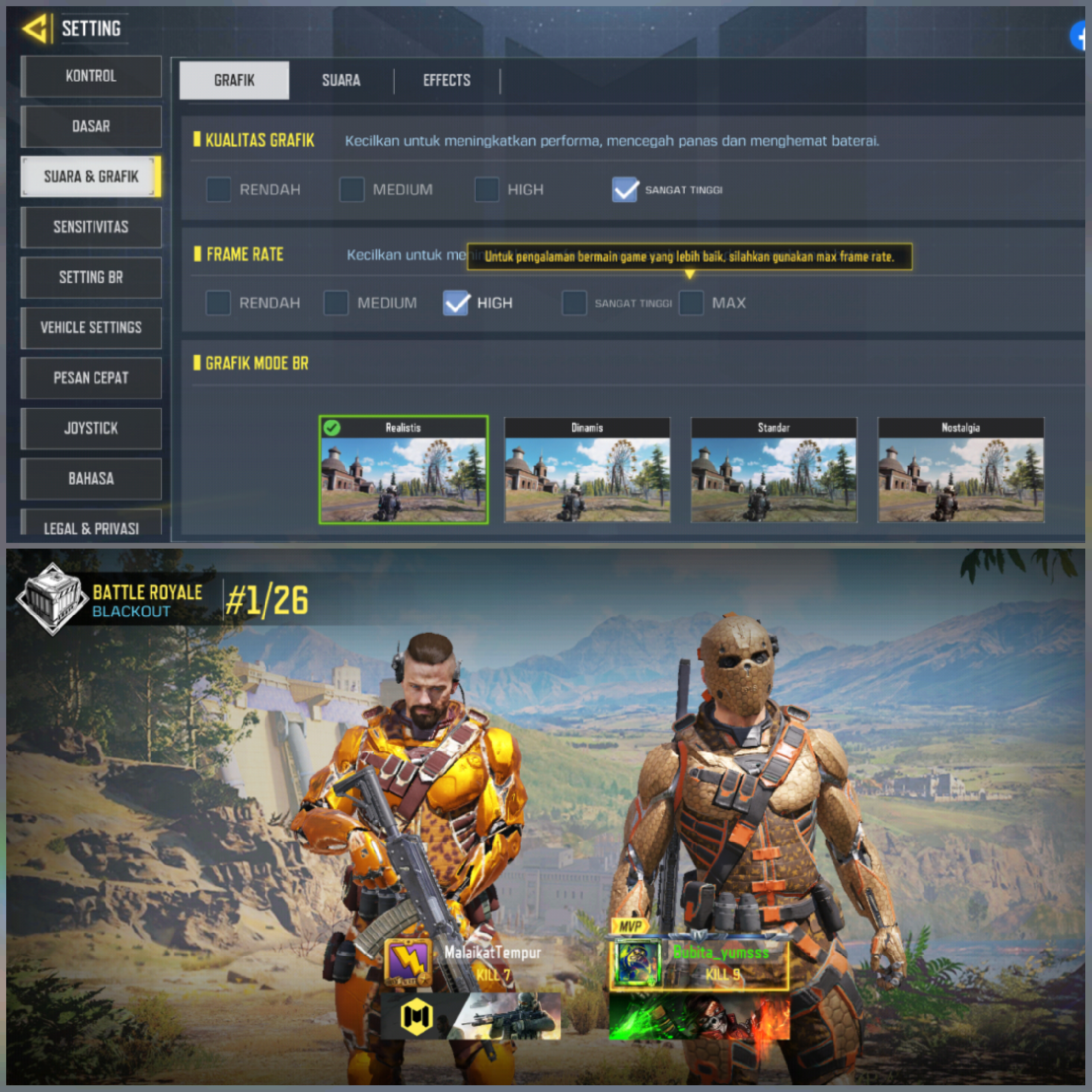 Dan menariknya lagi, pengaturan ini dibuat secara default saat memuat game untuk pertama kalinya. Tampak pada gamar kualitas grafik duduk di pengaturan ‘Sangat Tinggi’ atau mode ‘Very High’. Begitupun dengan frame rate-nya yang menggantung secara default di ‘High’ dan bisa dibuat mentok sampai ke mode ‘Max’.