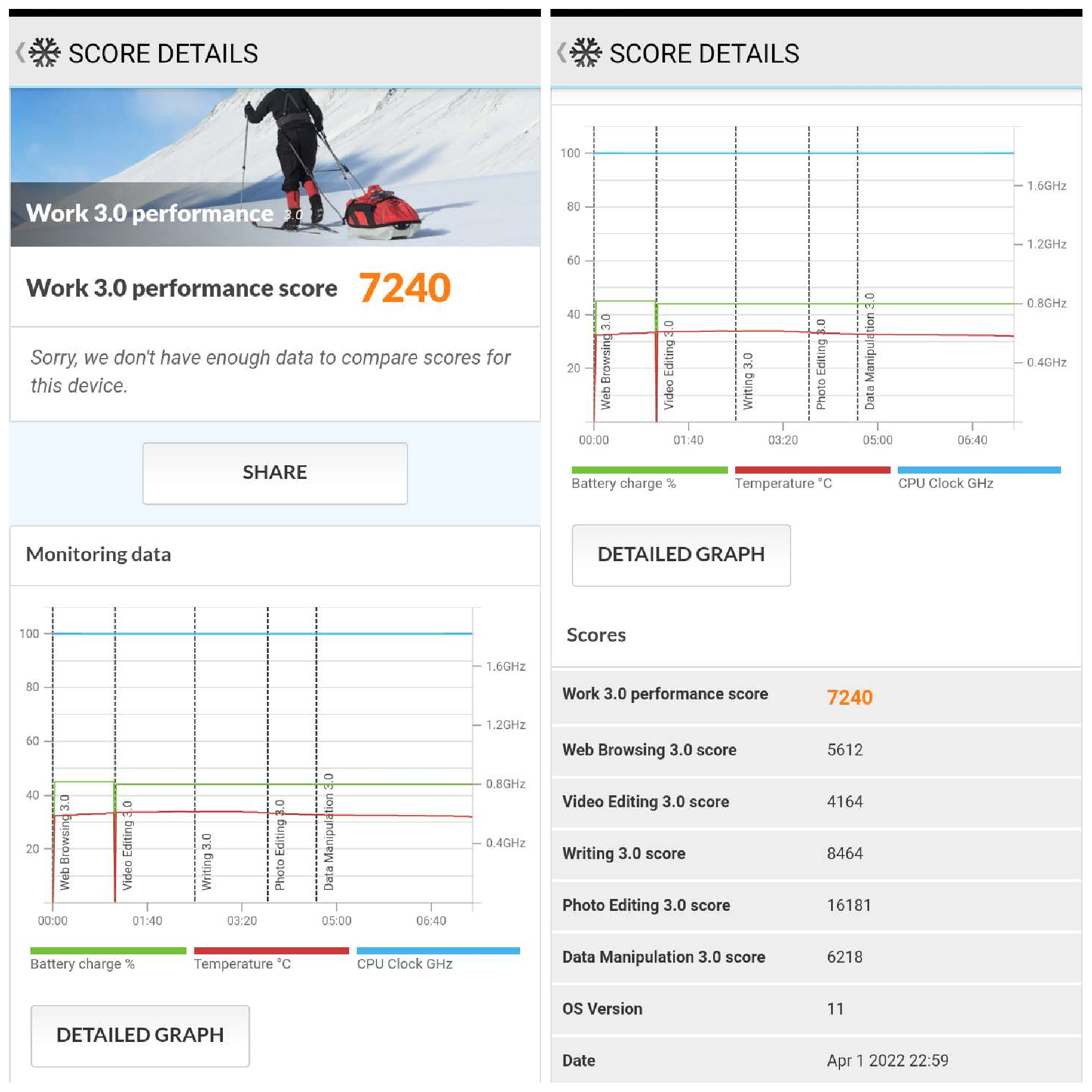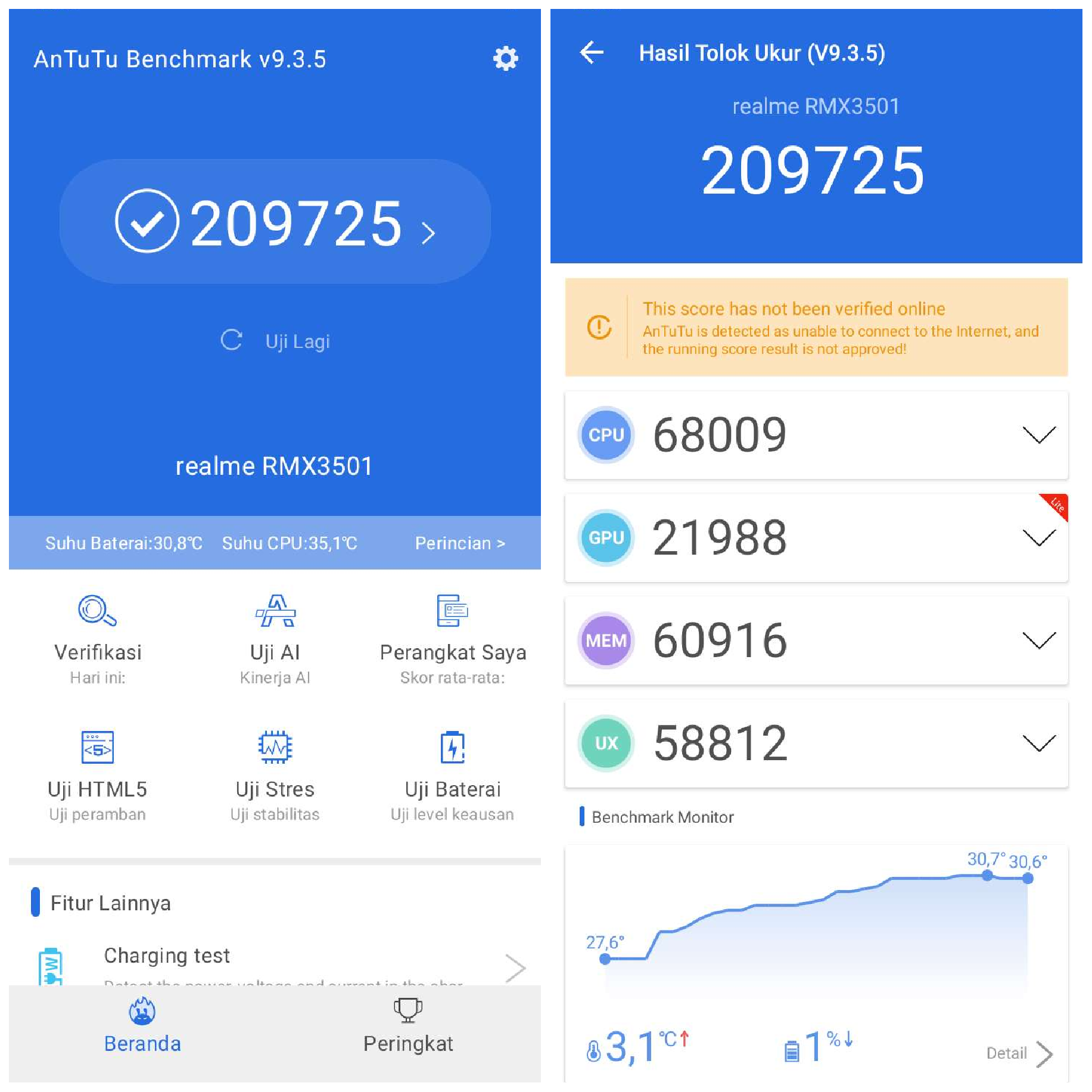 Seperti biasa, kami juga melakukan pengujian Realme C31 dengan sejumlah aplikasi benchmark seperti PCMark dan AnTuTu Benchmark. Hasilnya, skor perangkat ini juga nggak mengecewakan dengan perolehan AnTuTu di angka 209725. Sementara pada skor PCMark, Realme C31 bisa mencatat skor sebesar 7240.