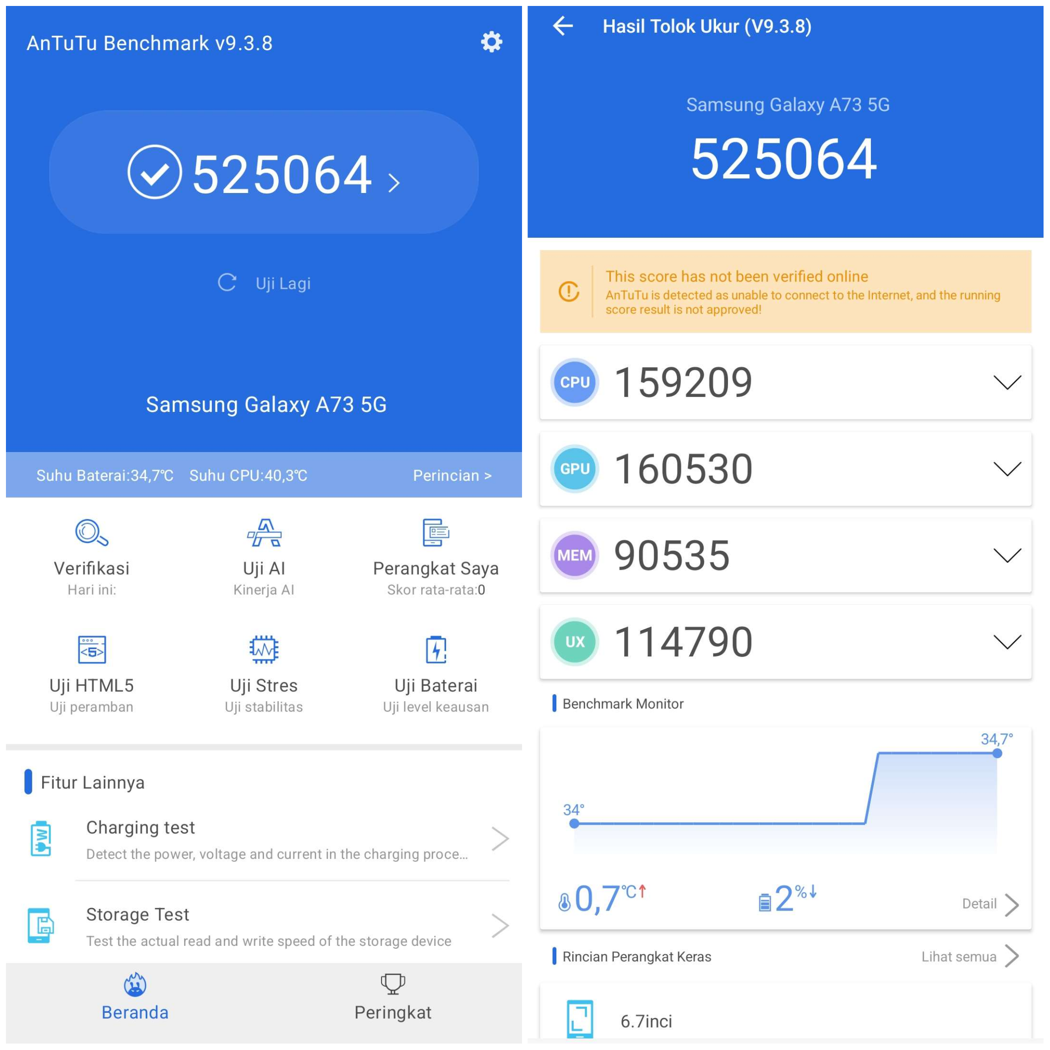 Uji benchmark smartphone Samsung Galaxy A73 5G. (Rian Alfianto/JawaPos.com)