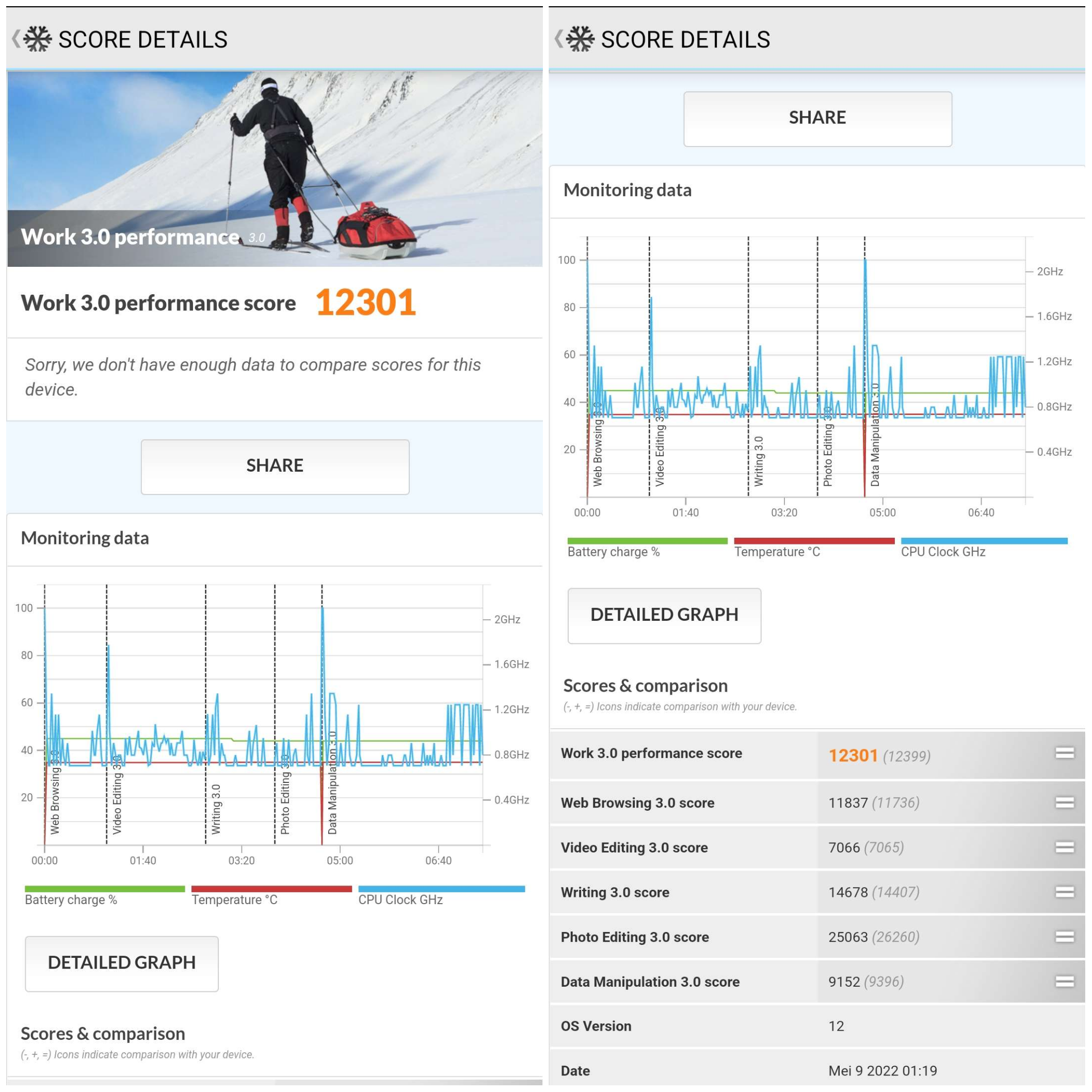 Dua aplikasi yang kami pakai, AnTuTu Benchmark v9.3.4 dan PC Mark Work 3.0 Performance. Pada pengujian aplikasi benchmark AnTuTu berhasil mencetak skor sebesar 525064. Kemudian, saat dibenchmark menggunakan PC Mark, skornya juga tergolong besar. Angka yang dicatatkan adalah 12301.