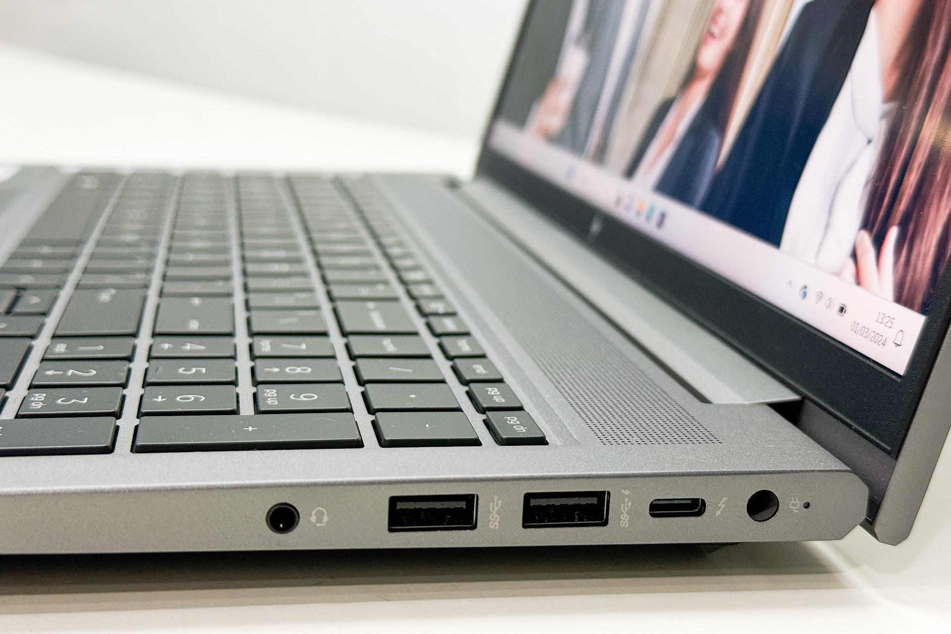 Laptop ini dilengkapi dengan layar 15,6 inci yang memiliki resolusi FHD (1920 x 1080) dan menggunakan teknologi IPS. Ini memberikan sudut pandang yang luas dan reproduksi warna yang baik. Keunggulan lainnya adalah kecerahan hingga 400 nits, sehingga cocok untuk penggunaan dalam ruangan maupun di luar ruangan dengan cahaya terang.