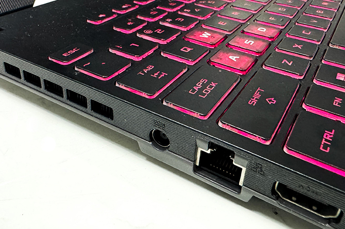 Tampak port HDMI, LAN RJ45, dan DC-in pada sisi kiri ASUS TUF A15, memberikan konektivitas lengkap untuk kebutuhan gaming. (Dhimas Ginanjar/JawaPos.com)