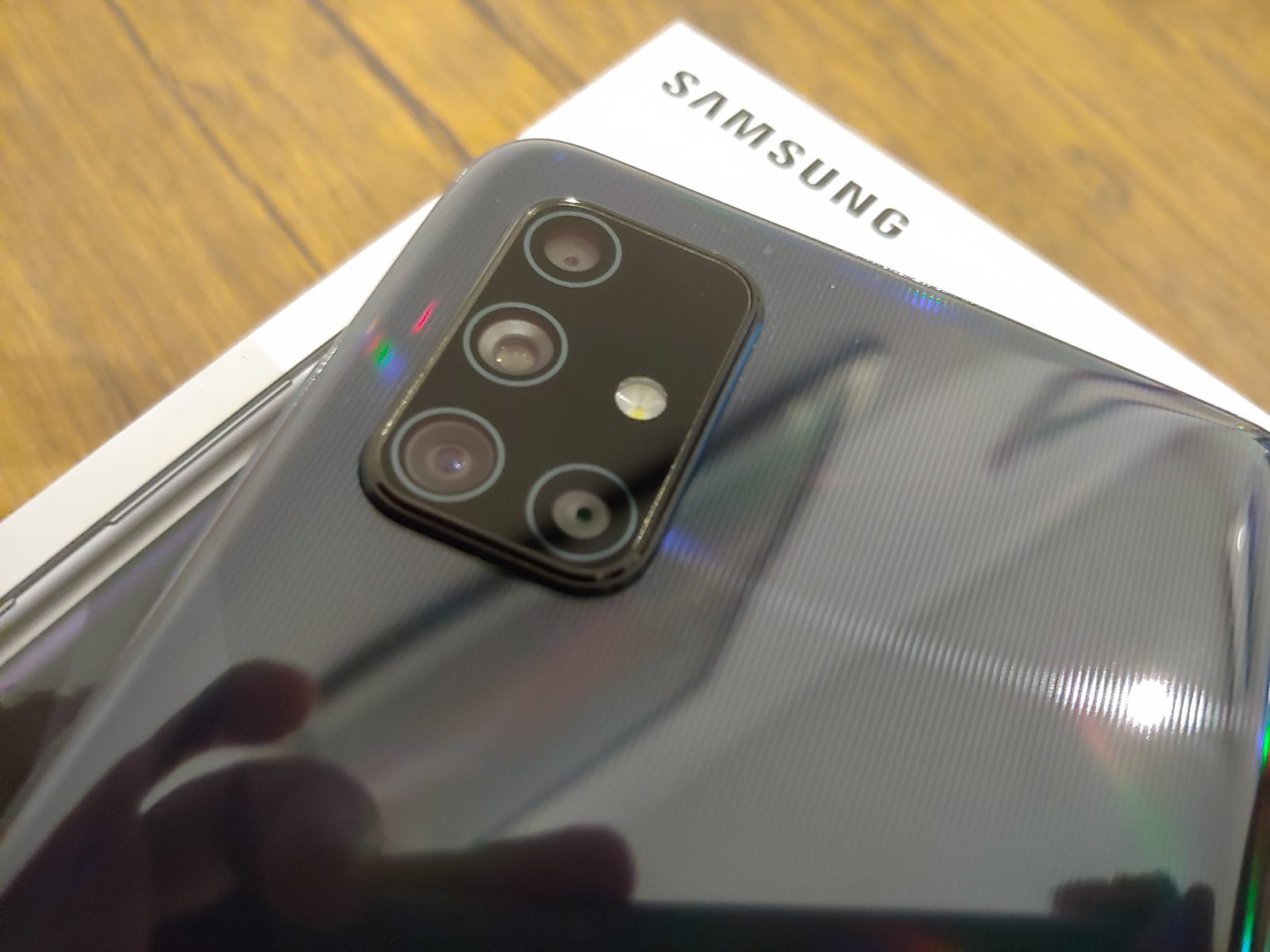 Samsung Galaxy A71 hadir dengan empat kamera utama atau quad camera. Penyusunan kameranya dibuat menyerupai huruf ‘L’. Di bagian belakang, selain area kamera dan LED Flash Light, Galaxy A71 terkesan polos. Kebetulan handset yang kami coba berwarna hitam, jika memilih warna lainnya mungkin akan berbeda seperti warna hijau atau putih.