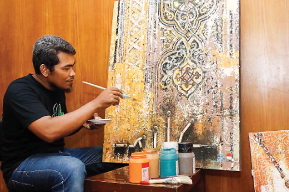 EVALUASI DIRI: Andiek Eko dengan karyanya saat dijumpai di kantor PW NU Jawa Timur. (Alfian Rizal/Jawa Pos)