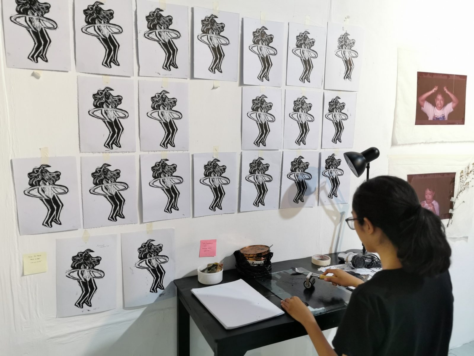 Dalam pameran ini, selain karya empat perupa muda itu, ada pula satu karya bersama yang mereka beri judul Ruang Catcalling. Karya instalasi ini disajikan di dalam ruang khusus seukuran kamar. Dinding tembok ruang tersebut ditempel potongan-potongan kertas bergambar bibir dalam beragam ekspresi. Ada bibir nganga dengan lidah sedikit terjulur, bibir tergigit gigi, hingga bibir menyungging senyum. Di sekitar potongan bibir itu tertempel kertas-kertas yang diisi pengunjung tentang pengalaman mereka melakukan atau mengalami pelecehan verbal.