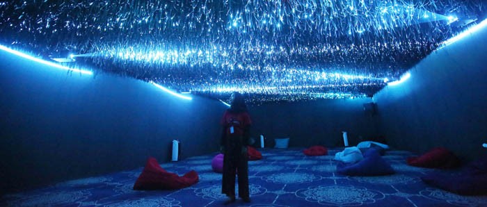 Setiap pengunjung akan disambut dengan instalasi yang memainkan komposisi strings dan cahaya bertajuk Ruang dan Batas dari Rubi Roesli.